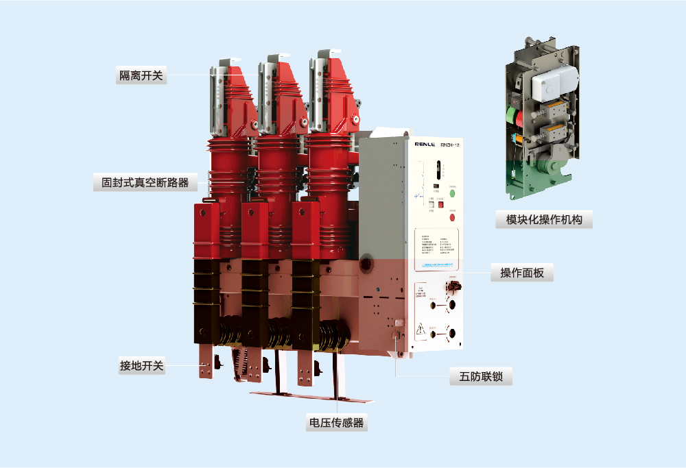 3、 主开关采用RNV1-12高压一体化真空断路器,带隔离刀闸,电流互感器,接地刀,传感器,采用模块化设计及组装,联锁可靠,维修方便。